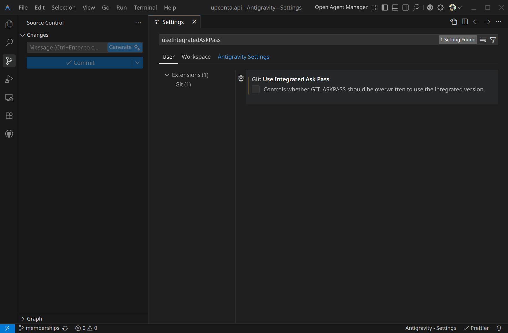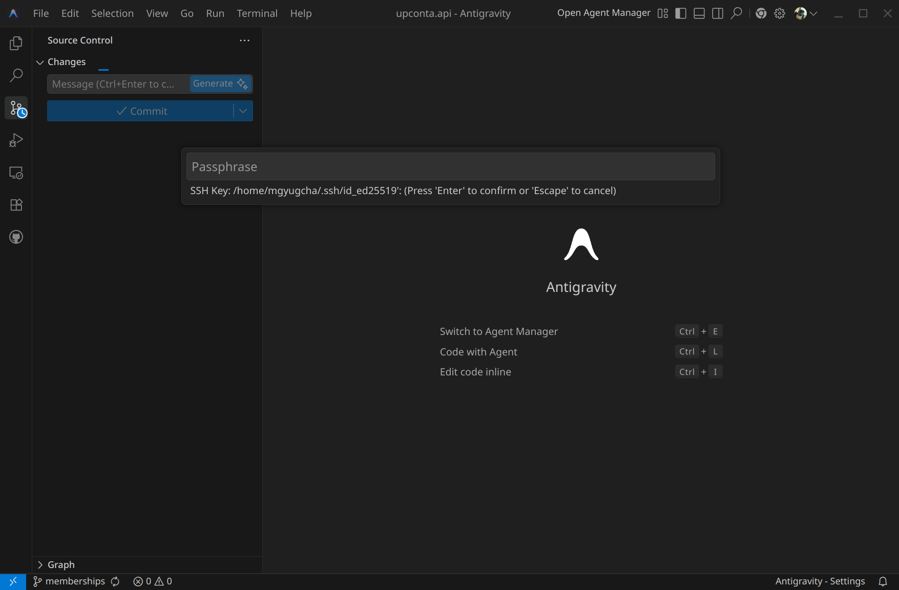 Visual Studio Code, o forks como Antigravity 🎉 o Windsurf, por defecto tienen activado su propio dialogo para ingresar la passphrase, que se muestra cada vez que queremos hacer un fetch, pull, pull al repositorio:
